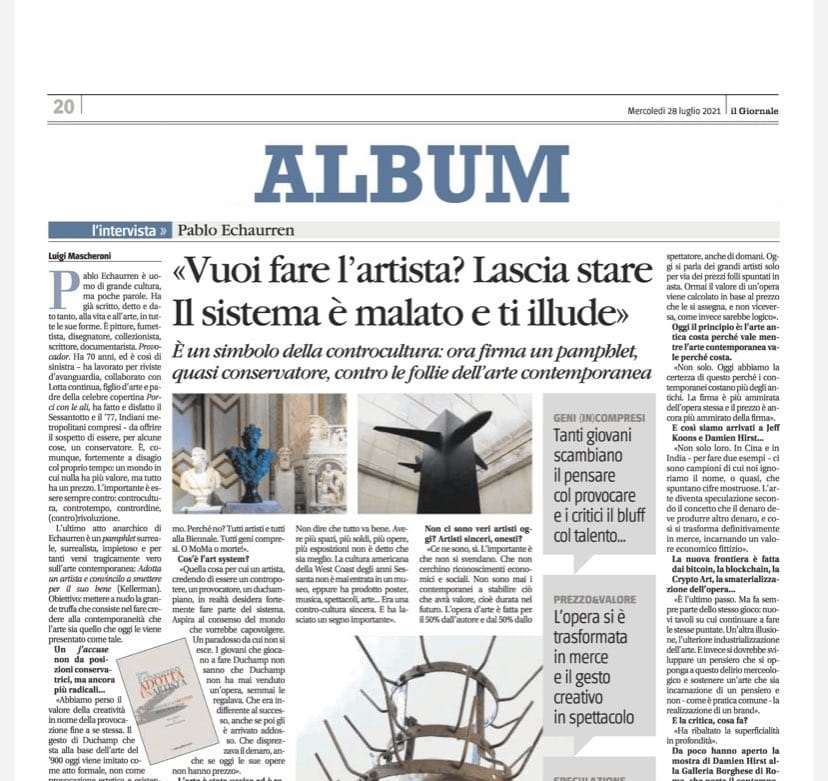 Un'intervista di Luigi Mascheroni a Pablo Echaurren pubblicata su "Il Giornale" mercoledì 28 luglio 2021.